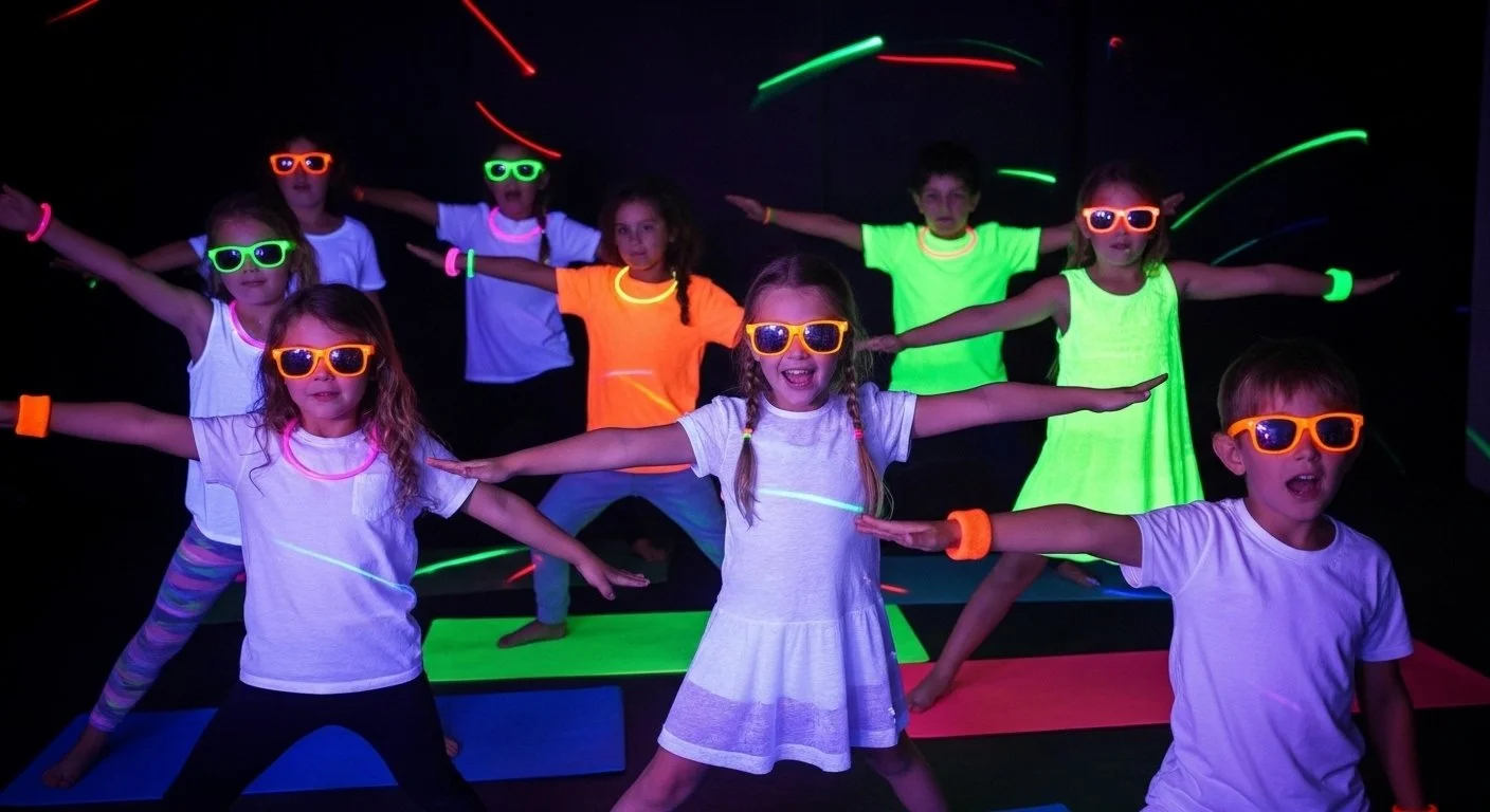 スタジオを暗くして、光と音の世界を楽しみます!ネオンカラーに輝くカップで乾杯した後は、音楽とともに暗闇ヨガ!白のドレスコードで、Let’s glow in the dark!